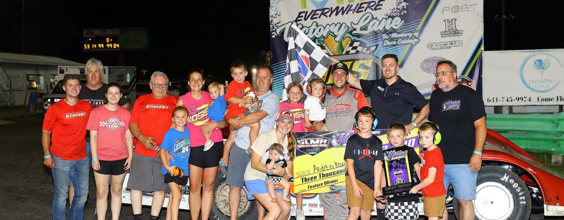Andrew Kosiski took home a big feature win during Saturday’s Gail and Karen Hampel Memorial at the Adams County Speedway.