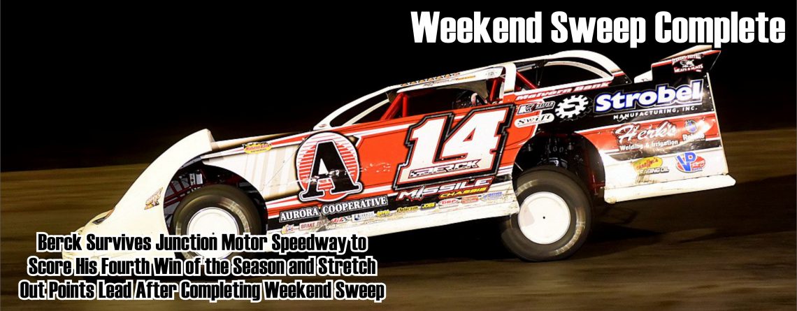 Kosiski, Berck, and Leonard brought the field back to green one more time. This time Berck utilized a strong restart to rocket by the 53 of Kosiski and into the lead. Leonard followed Berck by Kosiski as did Tad Pospisil. While Leonard and Pospisil worked their way past Kosiski on the restart pushing Kosiski back to fourth Kyle Berck checked out hunting for his 4th win of the season. Another yellow flag waved on lap 17 as Justin Zeitner came to a stop in turn 4 with a right rear flat.